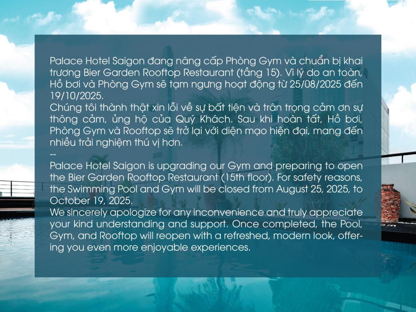 Facilities at the Palace Hotel Saigon also include an in-house spa with hot tub. Guests can sweat it out in the sauna room or relax with a professional massage. The hotel operates a 24-hour front deskstaff can assist bicyclecar rental, currency exchange and other concierge services. Shuttle services and airport transfers can be arranged upon request at a fee.